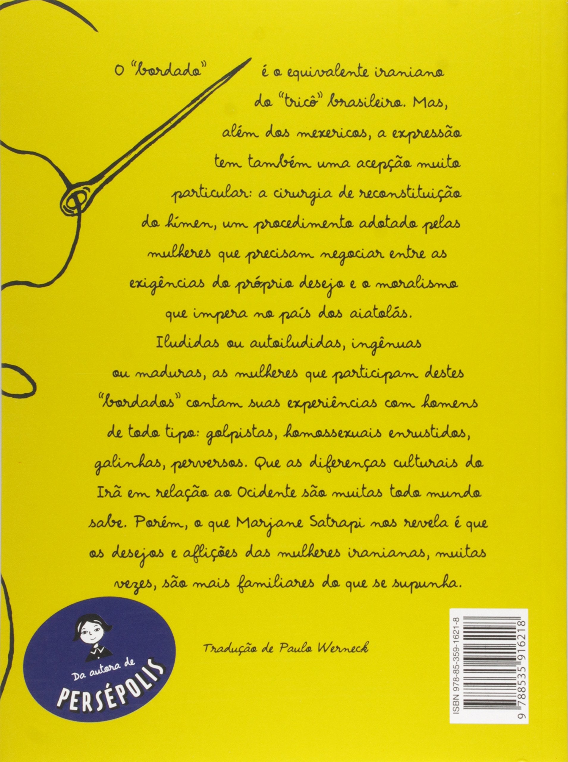 Os leitores de Persépolis reconhecerão aqui as marcas registradas da autora: o humor cortante, o traço simples em preto e branco, o feminismo mordaz, jamais patrulheiro. O "bordado" iraniano seria equivalente ao brasileiríssimo "tricô", não fosse uma acepção bastante particular: a expressão designa também a cirurgia de reconstituição do hímen, uma decisão pragmática para as mulheres que não abrem mão de ter vida sexual antes do casamento mas sabem que precisam corresponder às expectativas das forças moralistas do país.