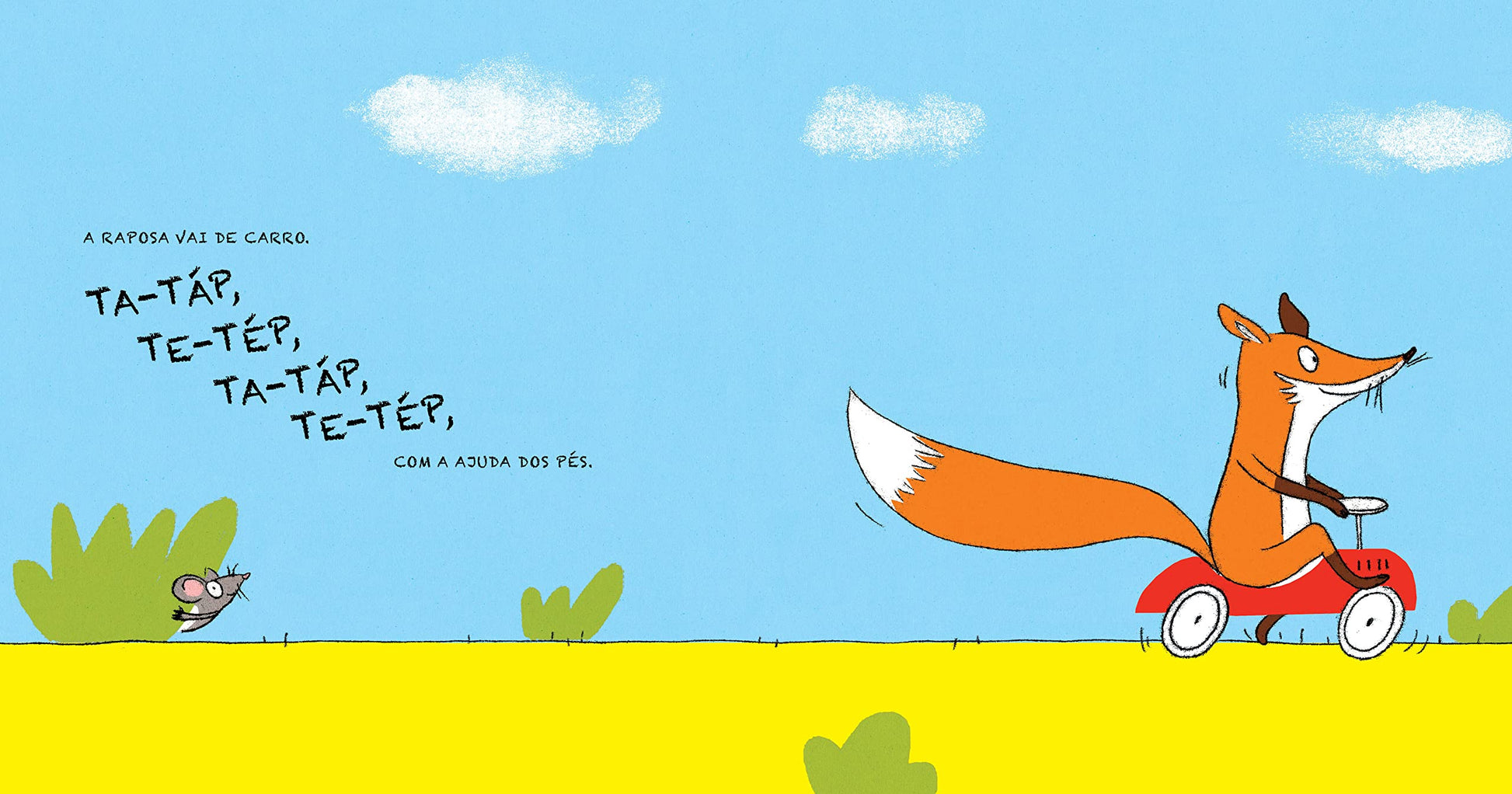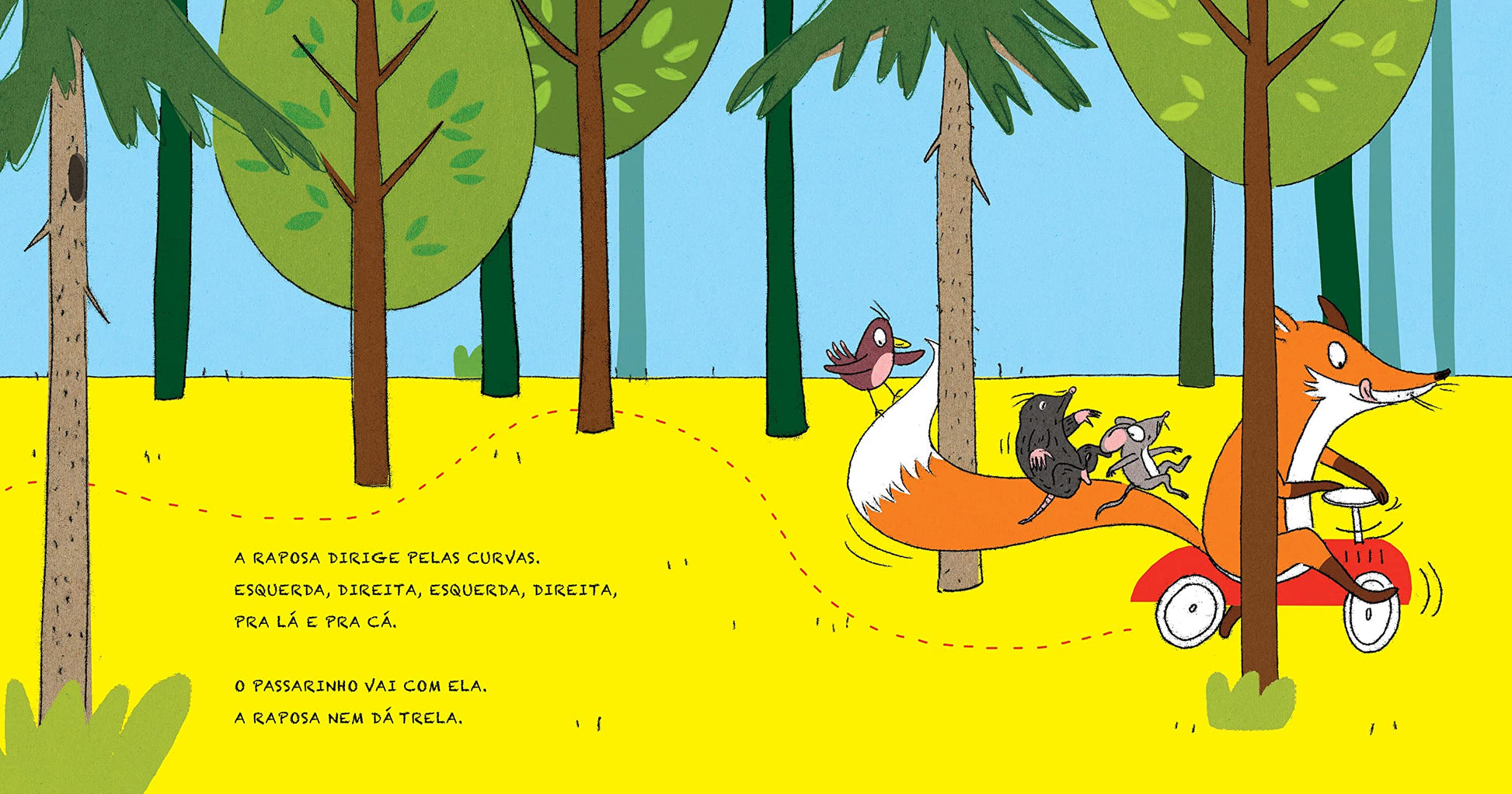 Uma raposa tremelica feliz pelos pedregulhos, desliza entre as poças e dirige pelas curvas com seu carro. Até que um ratinho se junta a ela, e a raposa nem dá trela. E depois a toupeira, o passarinho e a cobra também pegam carona… Opa! Como essa viagem vai terminar?