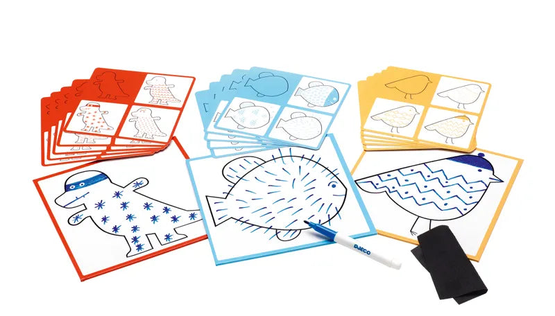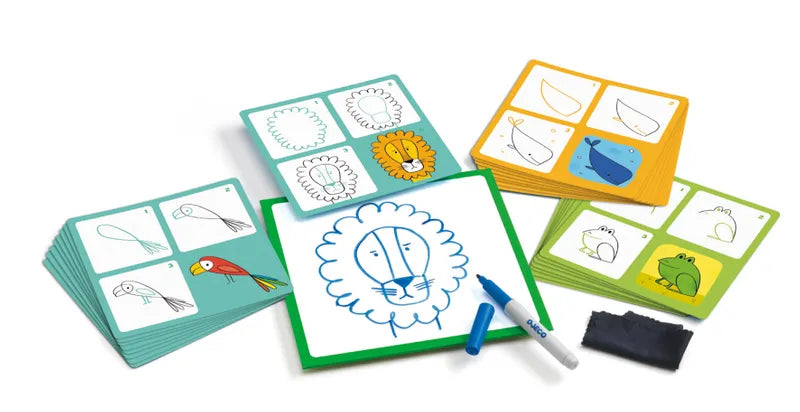 Animo and Co (4+): Kul pyssel där du lär dig rita olika motiv. Tema för detta kit är djur. Följ anvisningarna på de olika instruktionskorten steg för steg och lär dig rita olika motiv som t.ex. en groda, ett lejon, en snigel etc. Innehåller: 24 olika motiv med instruktioner, en raderbar ritplatta, en trasa att sudda med och en suddbar penna.