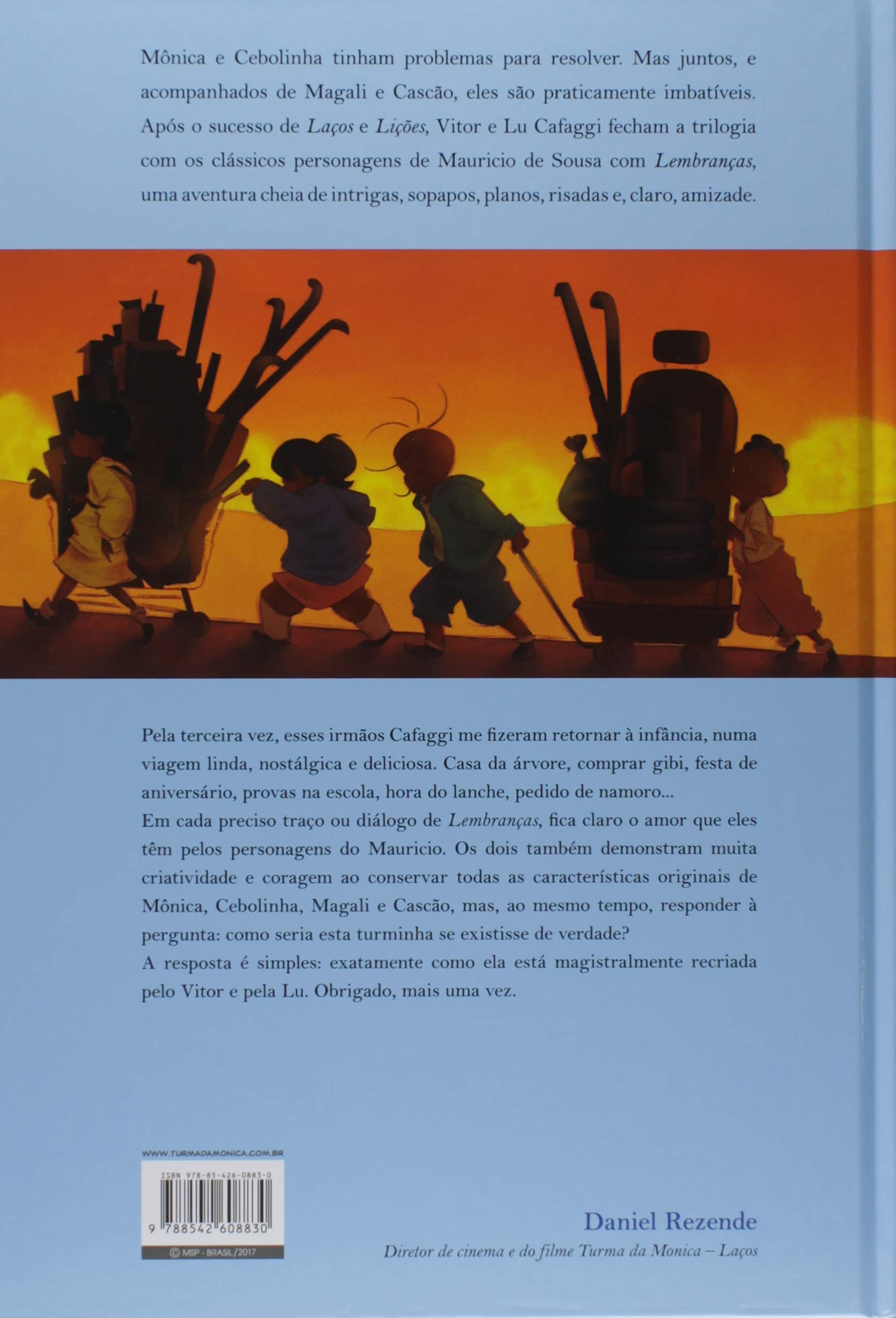 Mônica e Cebolinha tinham problemas para resolver. Mas juntos, e acompanhados de Magali e Cascão, eles são praticamente imbatíveis. Após o sucesso de Laços e Lições, Vitor e Lu Cafaggi fecham a trilogia com os clássicos personagens de Mauricio de Sousa com Lembranças, uma aventura cheia de intrigas, sopapos, planos, risadas e, claro, amizade.
